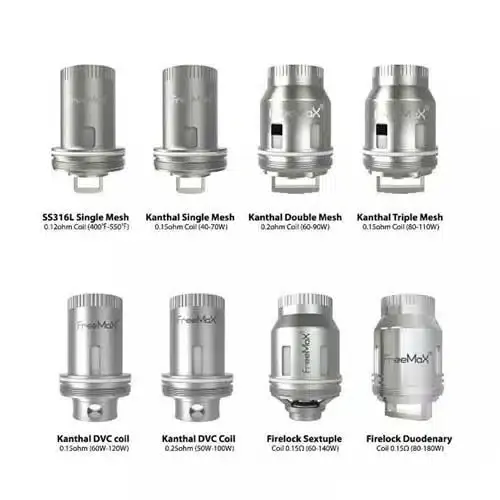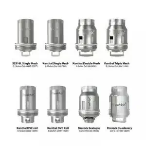 | Coil Types | 0.12ohm SS316L Single Mesh, 0.15 Kanthal DVC, 0.15ohm Firelock Duodenary, 0.15ohm Firelock Sextuple, 0.15ohm Kantal Single Mesh, 0.15ohm Kantal Triple Mesh, 0.15ohm Quad Mesh, 0.25 Kanthal DVC, 0.2ohm Kantal Double mesh |