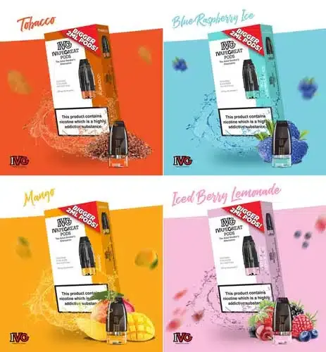 IVG Prefilled Pod, prefilled pods from I VAPE GREAT in 4 Great flavors ICED BERRY LEMONADE, BLUE RASPBERRY ICE, MANGO, and TOBACCO.
